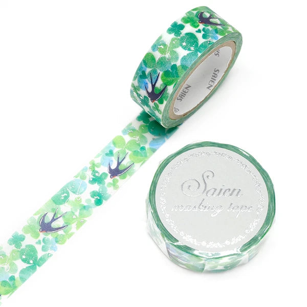 SAIEN マスキングテープ UR3063 ツバメとクローバー 銀箔 15mm×7m巻き