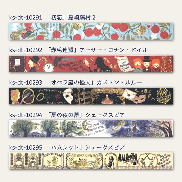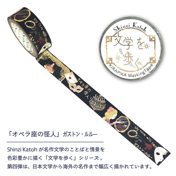 Shinzi Katohが名作文学の世界を色彩豊かに描く「文学を歩く」シリーズのきらぴかマスキングテープ第四弾です。日本の古典文学から海外の名作まで幅広く描いています。ゴールドホログラム箔の輝きが絵柄に奥行を与え、より情感あるデザインとなっています。